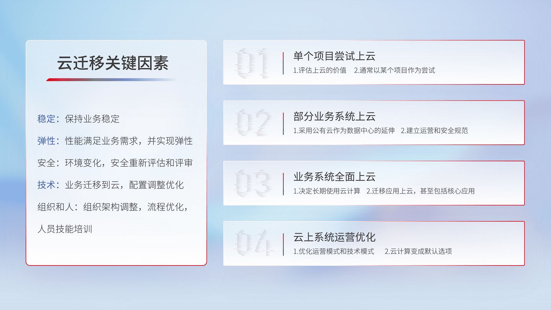 结合实际业务,,,从规划设计、、、、云平台选型、、、、云原生改造、、、数据迁移、、集成交付,,,,迁移全过程为客户识别最佳上云路径,,,,做好风险识别管理,,设计网络架构、、、身份权限、、、安全审计合规、、操作审计、、、、日志审计、、、、监控告警策略、、、多站点容灾设计等,,对云上基础设施进行整体规划,,提升IT治理水平,,,,以满足弹性、、、高可用、、高性能的需求。。。。