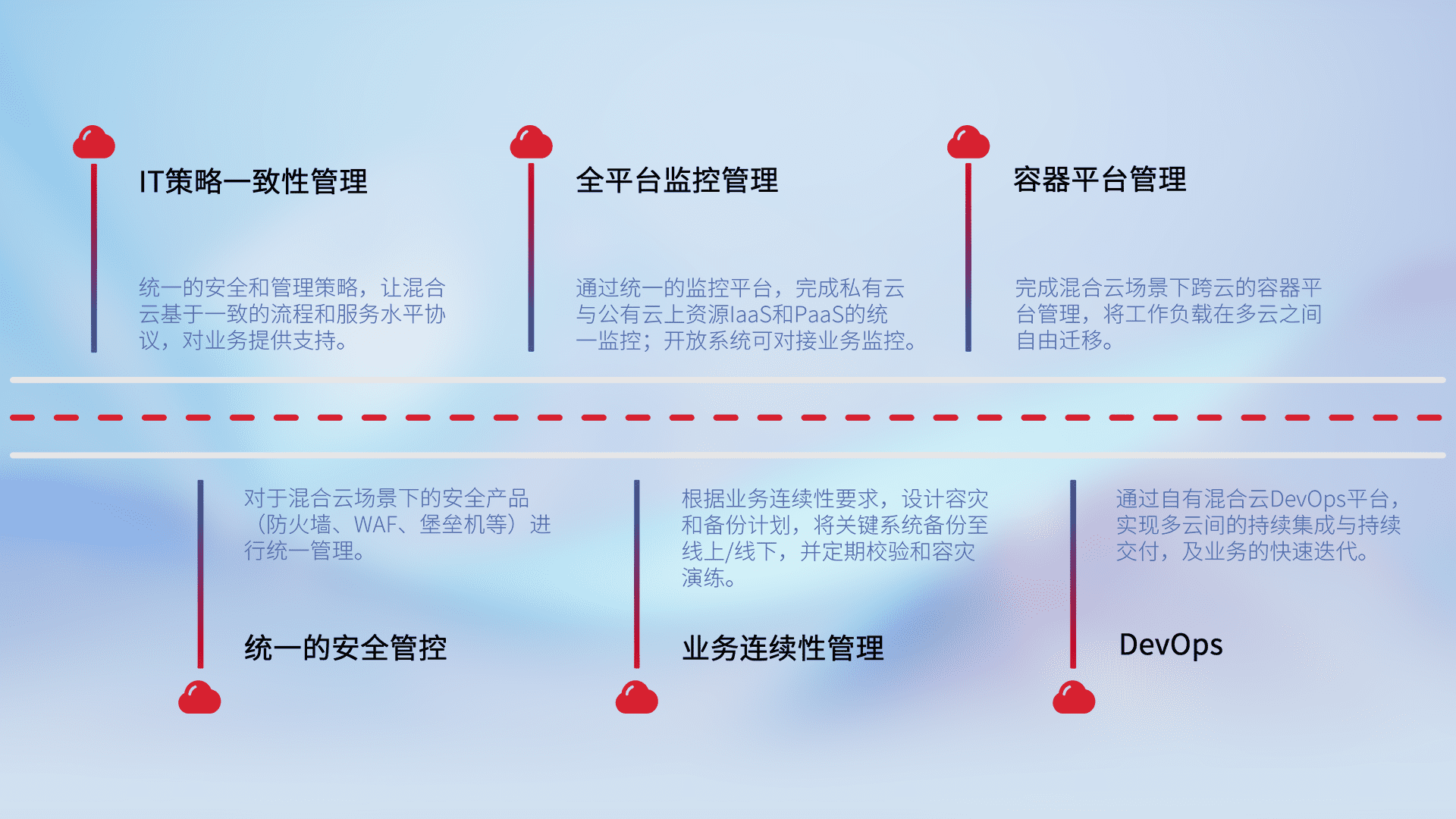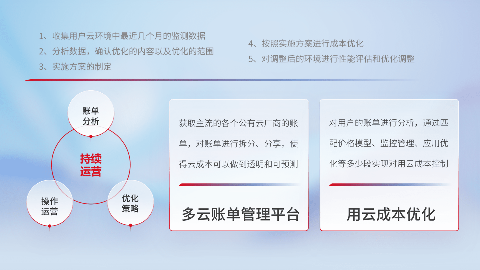 通过多云纳管,,以统一的资源数据模型把客户的云资源进行抽象和封装,,,,进而实现对多云资源的统一操作,,保障云资源管理的可靠性、、稳定性与可用性。。量身定制化运维内容,,,配置、、、开发运维、、、补丁管理、、、备份、、、监控、、、、认证和访问管理、、、、审计和日常巡检等,,,保障在用云过程中的可靠度,,,,稳定度以及高可用率。。。